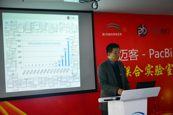 ? 接下來的學術(shù)交流環(huán)節(jié),PacBio公司亞太區(qū)市場部高級經(jīng)理錢祖衛(wèi)博士帶來了三代測序技術(shù)應(yīng)用的精彩分享,百邁客基因組高級技術(shù)總監(jiān)紀長綿分享了百邁客 公司與浙江大學借助三代測序等技術(shù)在Nature Genetics上發(fā)表的芥菜基因組文章,百邁客云市場部經(jīng)理孫瑛女士為大家介紹了百邁客云。儀式最后階段,基因組測序研發(fā)經(jīng)理楊帆帶領(lǐng)參會人員參觀了百 邁客的實驗室,講解了百邁客的發(fā)展歷程。