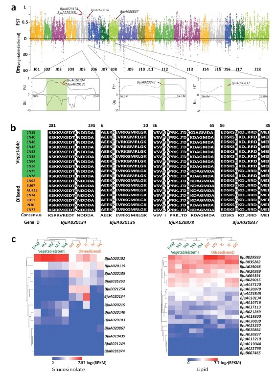 通過(guò)菜用和油用芥菜群體進(jìn)行選擇清除分析,發(fā)現(xiàn)dominance的基因被篩選出來(lái)的比例較高,同時(shí)結(jié)合轉(zhuǎn)錄組數(shù)據(jù),這部分基因在油用和菜用兩個(gè)群體中差 異表達(dá)。同時(shí)通過(guò)上面的分析發(fā)現(xiàn)與硫苷,脂類代謝顯著相關(guān)并且存在dominance的基因組,這些基因在油用菜用群體中有各自獨(dú)特基因分型。