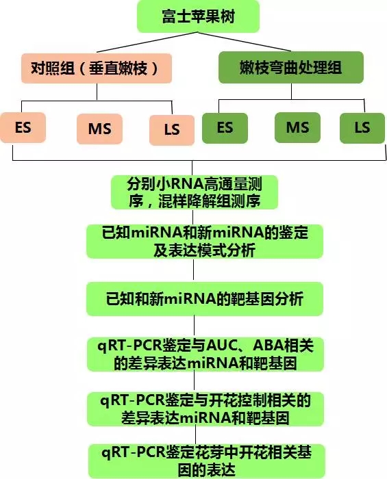生長六年大小的富士蘋果樹,分兩組進(jìn)行嫩枝彎曲(110度)、對照處理(垂直嫩枝),分別在開花誘導(dǎo)的初期(early stage,ES)、中期(Middle stage,MS)和晚期(Later stage,LS)取花芽,分別提取RNA進(jìn)行小RNA測序,6個(gè)花芽組織RNA混樣進(jìn)行降解組測序。