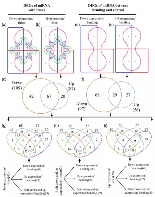 對同一處理不同發(fā)育時(shí)期樣品間(CMS vs CES, CLS vs CMS, CLS vs CES, BMS vs BES, BLS vs BMS and BLS vs BES)篩選了差異表達(dá)miRNA并繪制了維恩圖。結(jié)果顯示,其中42個(gè)miRNA下調(diào)表達(dá),20個(gè)miRNA上調(diào)表達(dá)。對不同處理相同發(fā)育時(shí)期樣品間(BES vs CES, BMS vs CMS and BLS vs CLS)篩選到124個(gè)差異表達(dá)miRNA,相對對照組,嫩枝彎曲處理組中68個(gè)下調(diào)表達(dá),27個(gè)上調(diào)表達(dá)。