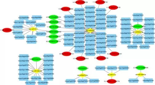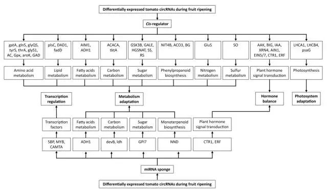 為了進(jìn)一步揭示circRNA在果實(shí)成熟中的作用,我們對(duì)circRNA靶向的miRNA以及miRNA的靶標(biāo)mRNA進(jìn)行了預(yù)測(cè)。結(jié)果發(fā)現(xiàn)其中20個(gè)circRNA上含有7個(gè)miRNA結(jié)合位點(diǎn),同時(shí)鑒定出94個(gè)miRNA的靶標(biāo)mRNA。通過(guò)對(duì)鑒定到的94個(gè)靶標(biāo)mRNA進(jìn)行GO富集和KEGG分析,總結(jié)出circRNA可能通過(guò)調(diào)節(jié)代謝過(guò)程、激素平衡以及光合相關(guān)的通路來(lái)調(diào)控番茄果實(shí)成熟。此外,circRNA還可能通過(guò)參與轉(zhuǎn)錄調(diào)控,主要是通過(guò)調(diào)節(jié)包括ERF、SBP、MYB等果實(shí)成熟相關(guān)的轉(zhuǎn)錄因子,來(lái)調(diào)節(jié)番茄果實(shí)的成熟。