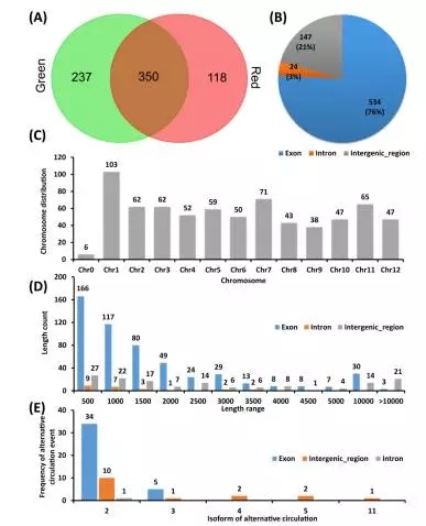 (A):共表達(dá)和特異表達(dá)分析;(B):來(lái)源分析;(C):染色體分布分析;(D):長(zhǎng)度分析;(E):可變剪切分析。