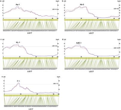 共定位到了26個和珍珠品質(zhì)相關(guān)的QTL,分別位于第1,4,8,14,15和17號連鎖群上,PVE范圍為8.45%-22.8%。在1號連鎖群上定位到3個殼寬QTLs,在第1和第15號連鎖群上分分別定位到1個控制殼重的QTL。第8號染色體上定位到體重相關(guān)的7個QTL,另外,作者也定位到了大量其他性狀的QTL。同時對第17號染色體上的4個和貝殼珍珠層顏色相關(guān)的QTL進行簡單的統(tǒng)計驗證。