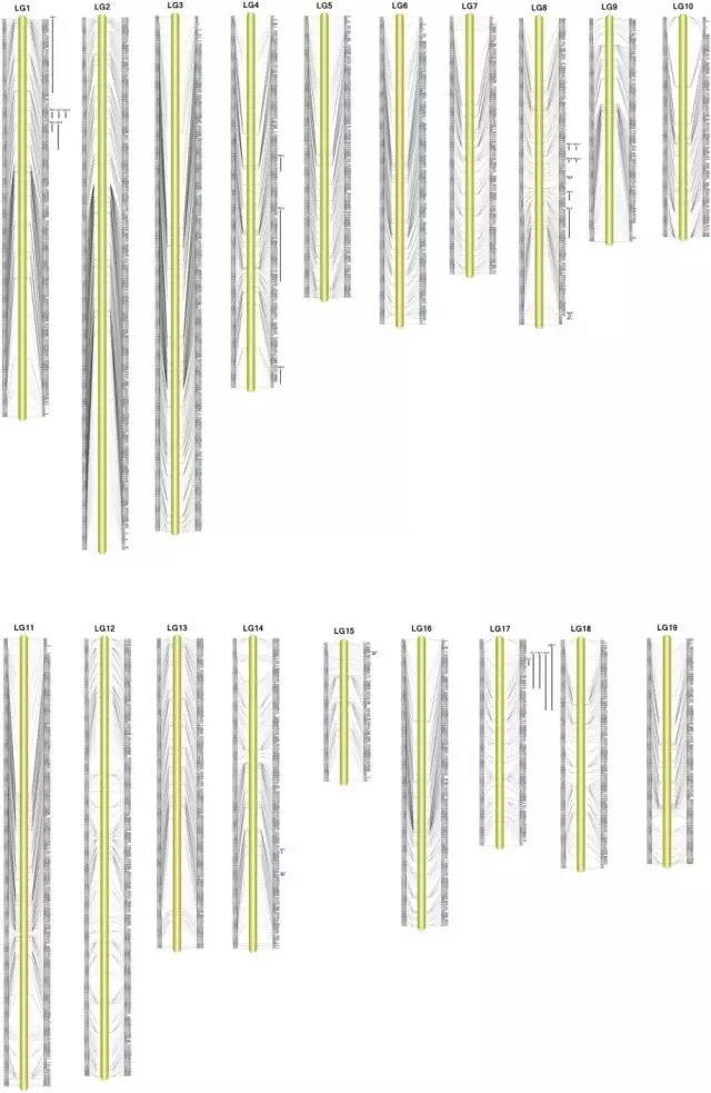作者之前利用SSR標記做的遺傳圖譜和利用SLAF-seq構(gòu)建的遺傳圖譜進行了比較。兩張遺傳圖譜均構(gòu)建了珍珠蚌19條連鎖群,但是標記數(shù),圖距,分辨率均不同。SSR標記包含了506個標記,總圖距1,922.3cM,平均圖距3,99cM,大的Gap數(shù)較多,而基于SLAF-seq的圖譜在以上指標上均顯著優(yōu)于SSR標記圖譜。