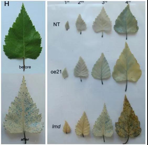 作者在研究BpGH3.5在樺樹中的功能時(shí)偶然獲得了lmd突變體。構(gòu)建的21株OE-GH3.5株系中,唯獨(dú)lmd葉片表現(xiàn)出壞死斑點(diǎn)并伴有早衰的現(xiàn)象。這很明顯是一種病變的表現(xiàn),當(dāng)這種情況出現(xiàn),很顯然我們要思考兩個(gè)問(wèn)題: