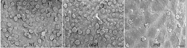細(xì)胞程序性死亡經(jīng)常伴隨著細(xì)胞結(jié)構(gòu)的變化,光學(xué)顯微鏡顯示lmd突變體的死細(xì)胞聚集在一起,而周圍的細(xì)胞是正常結(jié)構(gòu)的,死細(xì)胞并沒有明顯擴(kuò)散痕跡(圖6),表明lmd是起始型的類病變突變體。接下來(lái)作者用透射電鏡觀察了lmd葉片細(xì)胞的超微結(jié)構(gòu)。與oe21和NT相比,在lmd突變體中觀察到更多的死細(xì)胞,一些細(xì)胞產(chǎn)生吞噬作用,細(xì)胞器消失,只留下一個(gè)空細(xì)胞壁(圖7),這一結(jié)果表明了lmd突變體中發(fā)生了典型的細(xì)胞程序性死亡。樺樹葉片上有許多葉腺,在葉片成熟后會(huì)退化。由于lmd表現(xiàn)出葉片早衰現(xiàn)象,作者用掃描電鏡掃描葉片表面,以觀察lmd是否有變化。在第三個(gè)葉片上,發(fā)現(xiàn)lmd葉片上的葉腺體比NT和oe21葉片少(圖8)。SEM觀察表明,lmd確實(shí)發(fā)生了早衰。
