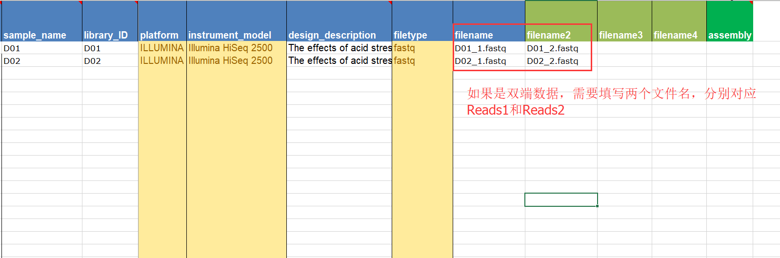 第七步:第六步表格上傳完成后,需要接著上傳Metadata表格,主要填寫樣品建庫測序的信息和需要上傳的文件名,填寫完成后也是導(dǎo)入到文本文件中然后上傳;