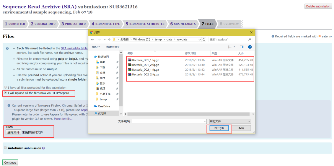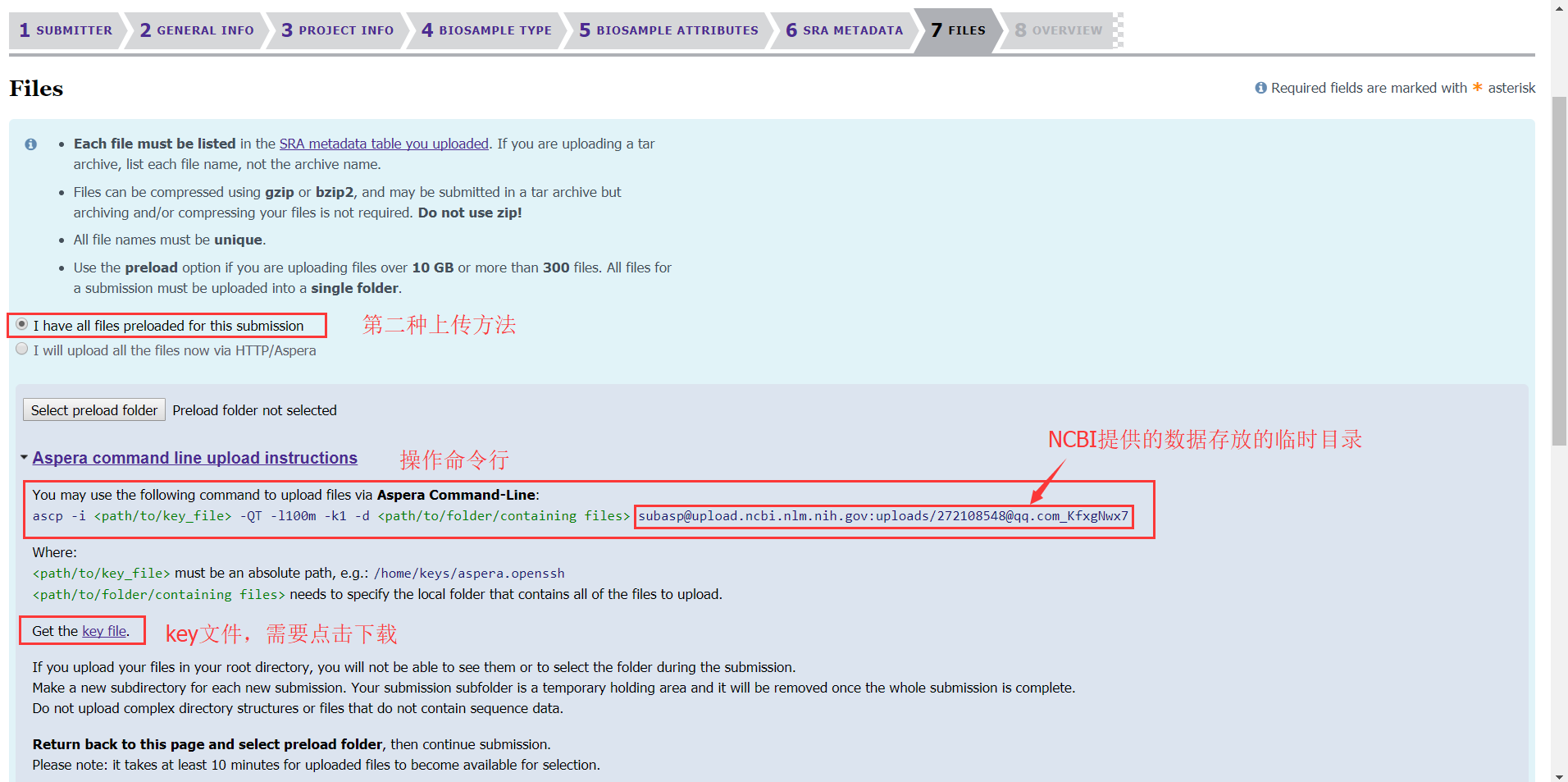 第八步:重點(diǎn)來了,這一步是將我們的數(shù)據(jù)傳到NCBI的服務(wù)器上,需要下載安裝一個軟件Aspera(http://downloads.asperasoft.com/connect2/,windows下也可以安裝)。軟件安裝完成后有兩種上傳方法:(1)可以直接上傳,適用于數(shù)據(jù)量小、樣本量小的項目;