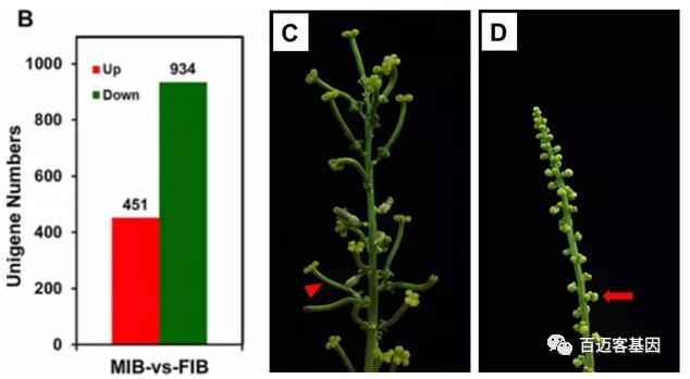 使用6-BA處理后成功誘導(dǎo)出雌性花序,F(xiàn)IB和MIB分別得到52876984和51201412條clean read(90bp),66723和67019條unigene,平均長(zhǎng)度為775bp和750bp,約78.45%的基因得到注釋。篩選條件為FDR<=0.001和log2(FC)>=1,得到1385個(gè)差異基因,F(xiàn)IB相比于MIB,有451個(gè)基因上調(diào),934個(gè)基因下調(diào)。