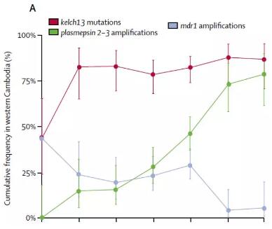 東南亞地區(qū)惡性瘧原蟲瘧疾的一線治療雙氫青蒿素-哌喹聯(lián)合治療,然而近年來在柬埔寨西部和泰國(guó)西部等地區(qū)出現(xiàn)了對(duì)這些治療耐藥的情況,并在東南亞迅速蔓延。2013年首次發(fā)表了柬埔寨西部的抗瘧疾藥物耐藥報(bào)告,最近《THE LANCET infectious Diseases》分析了該報(bào)告發(fā)表前的6年里柬埔寨西部惡性瘧原蟲種群的遺傳變化。
