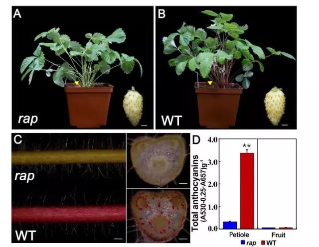 作者利用ENU誘變產(chǎn)生了綠色葉柄和葉片的突變體rap,相較與野生型YW5AF7,rap表皮細胞的色素沉著大大減少,葉柄的橫截面脈管系統(tǒng)周圍皮層細胞中顯示出相同的變化,且與色素減少表型相一致的是rap葉片葉柄中總花青素含量顯著降低(P <0.01),rap和YW5AF7對照果實中花青素含量都極低(圖1)。通過對已知花青素合成途徑相關(guān)基因表達及測序分析,RAP為一新基因參與花青素的積累,調(diào)控草莓的生長發(fā)育。