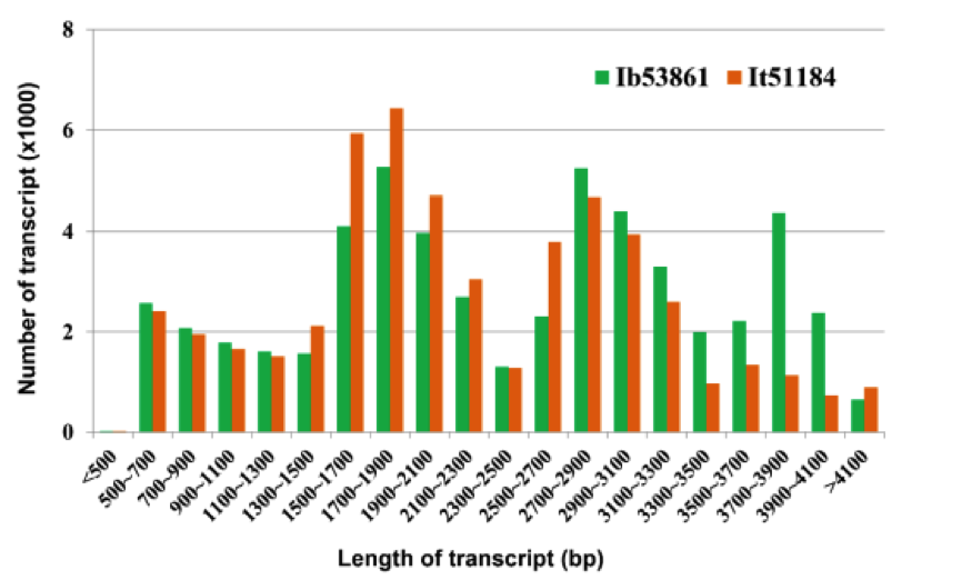 圖3. 在甘薯(Ib53861)和野生甘薯(It51184)中的53,861個(gè)非冗余轉(zhuǎn)錄物的數(shù)量和長度分布。