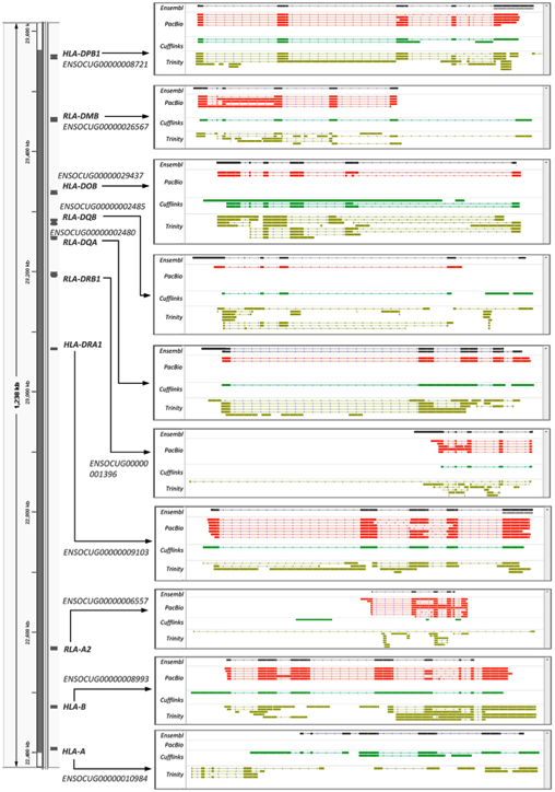Figure 4.基因通過PacBio所測轉(zhuǎn)錄本和組裝得到的轉(zhuǎn)錄本還原10個(gè)MHC基因。染色體定位、命名和每個(gè)基因的Ensembl編號(hào)(在左側(cè))
