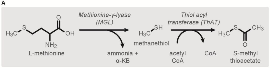 圖3 A)S-methyl thioesters生物合成過程和B)CmThAT 1定位結(jié)果