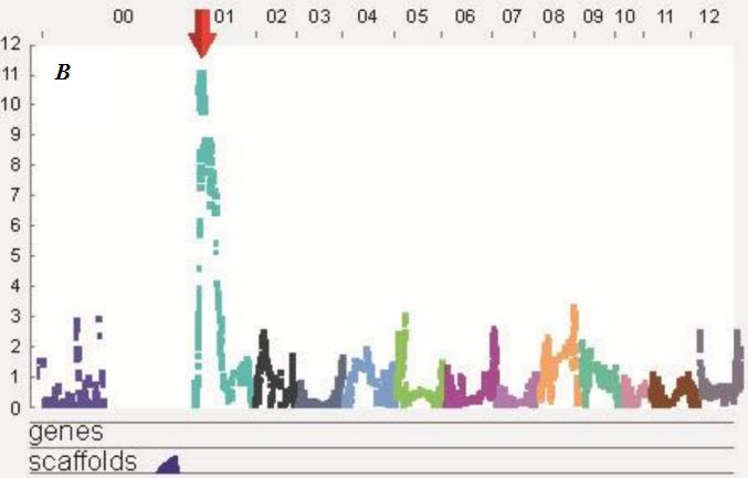圖4 A)CmPPR 1基因定位和B)CmPPR 1不同SNP類型的表型