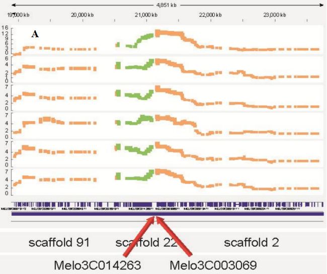 每個樣品產(chǎn)生5-15M的100bp序列,與參考基因組比對獲得82140個SNP,甜瓜基因組預(yù)測有27427個基因,本研究共有16000個基因表達(dá)。以SNP為基礎(chǔ)劃bin,所有個體共檢測到6636個重組事件,產(chǎn)生3663個bin(圖1A),bin的平均長度為72.6kb。遺傳圖譜構(gòu)建總圖距為2047cM,利用該圖譜進(jìn)行對之前未能掛載染色體的scffold進(jìn)行掛載,并對部分組裝錯誤進(jìn)行了糾正(圖1B中圓圈)。