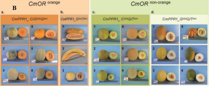 親本:414(非甜,淺橙色果肉,難聞氣味),Dul(甜味,深橙色果肉,芳香氣味)