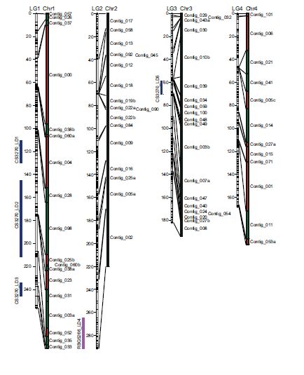 通過對CS3270和 RBG5266雜交而來的178個子代測序數(shù)據(jù)分析,構(gòu)建出含有1512個marker的4條連鎖群,總圖距898cM,平均圖距0.59cM。依據(jù)遺傳圖譜,57個scaffold被明顯分群,共35.7M被組裝,11個scaffold共1.1M依據(jù)禾谷鐮刀菌序列組裝到基因組,22個scaffold共262kb長度不能被組裝至基因組。對其功能注釋,冠腐病菌中預(yù)測到了12447個基因,其中含有FpDLH1等毒性基因。