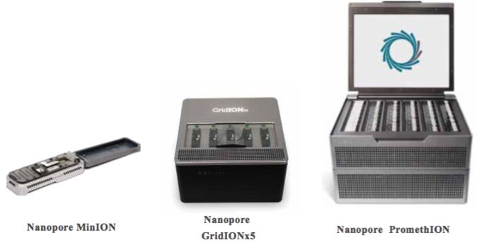 Oxford公司的Nanopore測序技術(shù)借助單個(gè)分子通過納米孔時(shí)引起孔兩側(cè)電位差來實(shí)現(xiàn)信號檢測,納米孔的直徑僅允許單個(gè)核苷酸聚合物通過,而ATCG四種堿基的帶電性質(zhì)不同,因此通過電信號差異特征即可檢測出通過納米孔的堿基類型,從而實(shí)現(xiàn)測序,目前主要測序平臺為Nanopore MinION、Nanopore GridIONx5、 Nanopore PromethION。