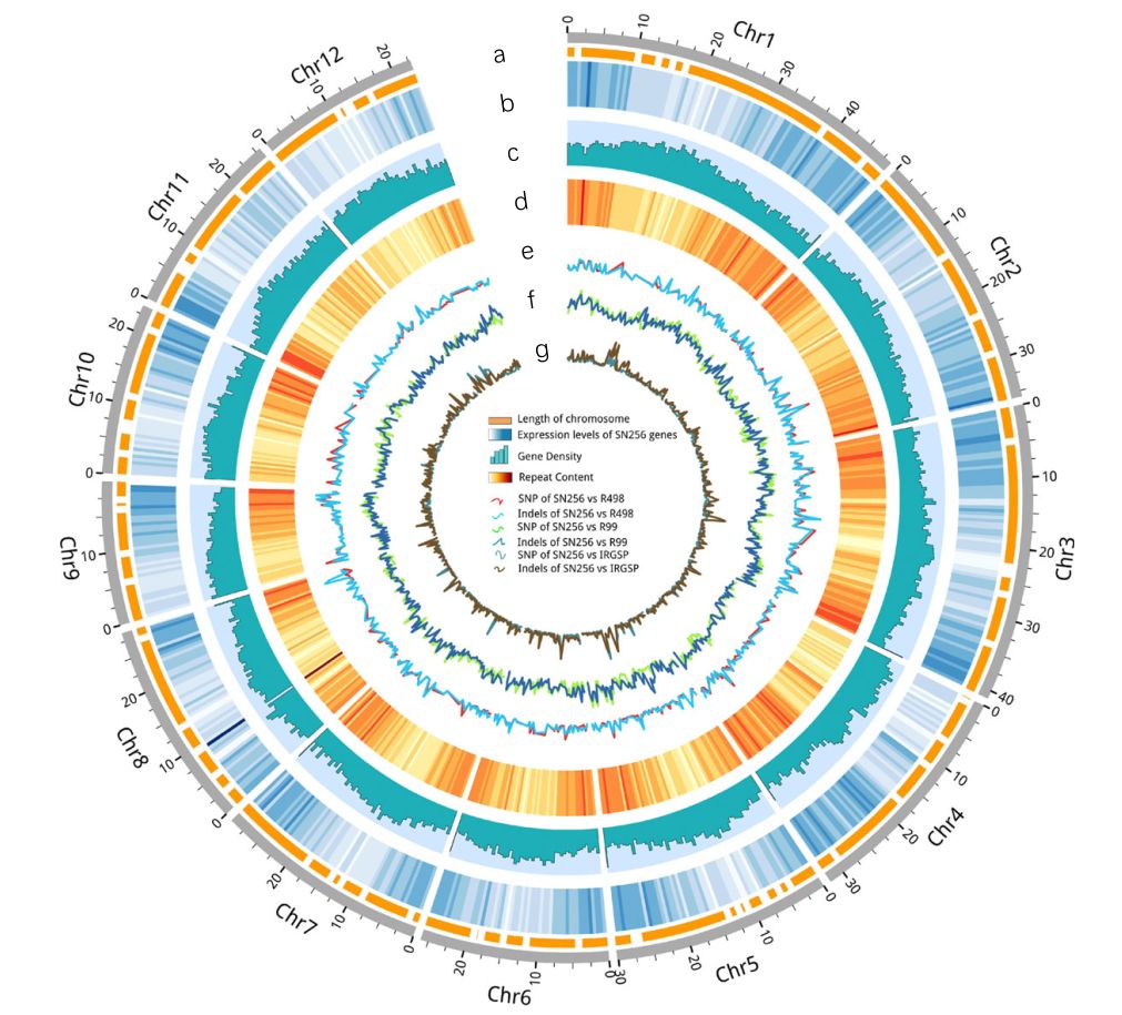 為了填補北方超級稻高質(zhì)量基因組序列的gaps,作者對SN265基因組進行了de novo測序和組裝。利用P5-C3 SMRT測序,獲得24.94 Gb的原始數(shù)據(jù),平均讀長為9.6 kb,二代測序共獲得22.05 Gb的原始數(shù)據(jù),組裝得到SN265的基因組,大小為364.45 Mb,contig N50 達到6.96 Mb,通過從頭預(yù)測、同源預(yù)測以及RNA-seq分析后共獲得37,609個基因(圖2)。對R99進行低深度(30×)三代重測序和基因組組裝,獲得了R99389.6 Mb的基因組,contig N50也達到3.05 Mb(圖2)。