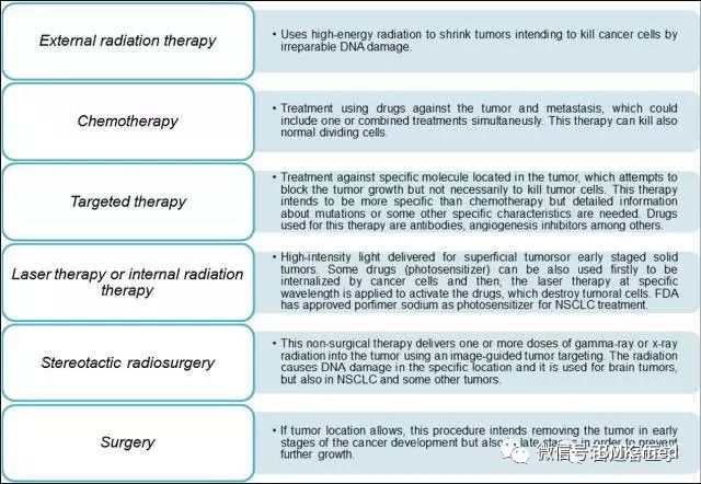 高強(qiáng)度射線照射表淺腫瘤或早期實(shí)體性腫瘤??墒紫葢?yīng)用某些藥物(如光敏劑),使其進(jìn)入腫瘤細(xì)胞后再應(yīng)用特定波長的微波進(jìn)行激光治療、?激活這些藥物從而破壞腫瘤細(xì)胞。FDA已批準(zhǔn)卟吩姆鈉(porfimer?sodium)用作NSCLC治療的光敏劑;