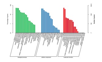 對27,829個轉錄本進行數據庫功能富集和分類注釋分析,25,809個轉錄本被注釋。NCBI-Nr數據庫比對顯示,轉錄本匹配到一系列物種(圖1)。Nr數據庫中比對上轉錄本共有25,653個(92.18%),52.04% 轉錄本與虹鱒(Oncorhynchus mykiss)相似,其次是大西洋鮭(Salmo salar)(23.53%)和梭子魚(Esox lucius)(14.01%),其余匹配的物種不到10%。GO數據庫注釋16,612個(59.69%)轉錄本,富集到兩個與免疫相關的亞類,分別是“響應刺激”(3,124個轉錄本)和“免疫系統過程”(851個轉錄本)(圖2)。將轉錄本與KEGG數據庫比對,共有16917個轉錄本富集到271個通路。免疫相關的KEGG通路主要包括細胞因子-細胞因子受體相互作用(106個基因)、Toll-like受體信號通路(51個基因)、IgA產生的腸道免疫網絡(20個基因)等。