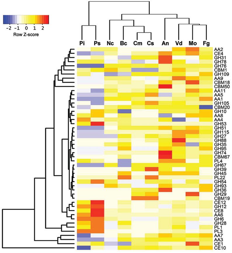 成熟的植物致病真菌可以分解并利用CAZymes的植物細(xì)胞壁多糖。尾孢菌(Cercospora sojina)含有596個(gè)預(yù)測的CAZymes。與其他真菌相比,C.sojina具有更大的潛在碳水化合物酯酶組,其可催化取代糖的N-去?;?。在C. sojina基因組中,有大約23.5%的潛在分泌蛋白被預(yù)測為CAZyme,證明C.sojina可能在入侵期間使用大量CAZymes來消化宿主細(xì)胞壁。有趣的是,其中一個(gè)CAZymes家族,即糖苷水解酶GH109家族,是高度富集的(圖6)。