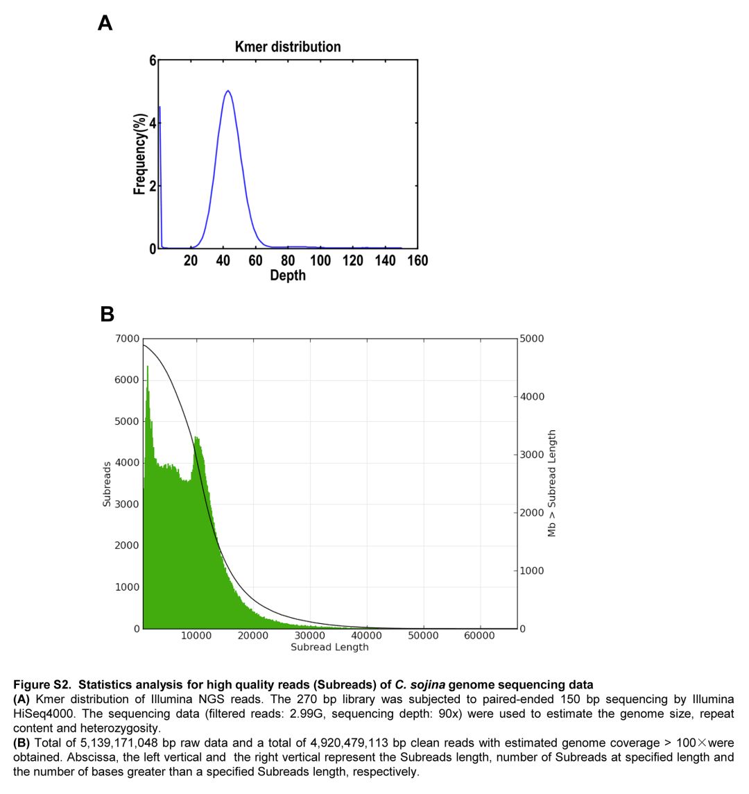 像大多數(shù)真菌一樣,C. sojina表現(xiàn)出類似的感染周期,但它也表現(xiàn)出一些區(qū)別(圖S1)。它不形成附著物,但分枝菌絲能通過開放氣孔感染植物(圖S1C和D)。與其他半營養(yǎng)真菌相比,F(xiàn)LS疾病發(fā)展相對較慢(圖S1C)。Kmer峰圖顯示該菌為單核真菌。(圖S2)