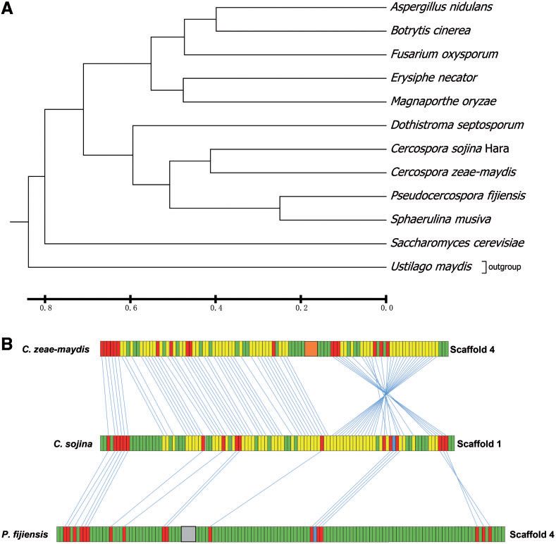 Figure 3.Phylogenetic and synteny analysis of?C. sojina?with other fungal species.