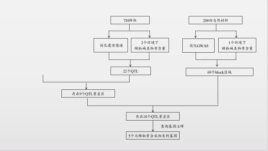 聯(lián)合分析結(jié)果:基于相同的參考基因組,通過(guò)比較QTL分析與GWAS分析的定位結(jié)果的物理位置發(fā)現(xiàn)GWAS結(jié)果中10個(gè)區(qū)域與本研究QTL定位結(jié)果重疊,查詢注釋結(jié)果,發(fā)現(xiàn)5個(gè)基因與辣椒素生物合成途徑相關(guān)基因。