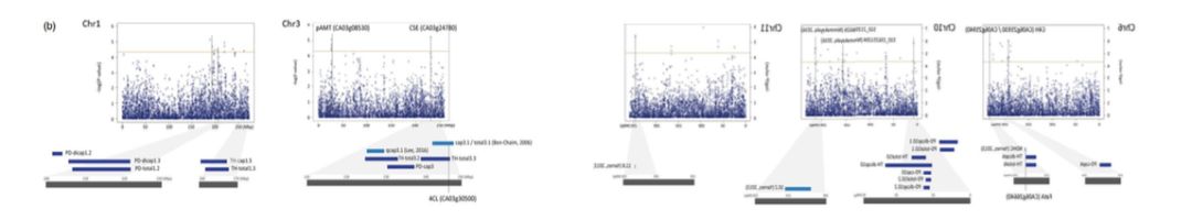 QTL定位結(jié)果:利用120個(gè)PD單株構(gòu)建的重測(cè)序遺傳圖譜和3個(gè)環(huán)境下的56個(gè)單株表型數(shù)據(jù)定位到22個(gè)QTL位點(diǎn)。其中LOD值最高的是PD-dicap1.1 (LOD=8.7),表型變異率(R2)最高的是PD-dicap10.2 (28.8%)。同樣地,85個(gè)TH單株構(gòu)建的簡(jiǎn)化圖譜和2個(gè)環(huán)境的表型數(shù)據(jù)定位到22個(gè)QTL位點(diǎn)。其中LOD值(LOD=9.9)和R2(18.8%)最高的都是TH-cap2.2。兩者分析時(shí)均用CM334作為參考基因組,因此可以對(duì)2個(gè)群體的QTL定位結(jié)果進(jìn)行比較,發(fā)現(xiàn)PD群體的9個(gè)QTL位點(diǎn)與TH群體的7個(gè)QTL位點(diǎn)的物理位置重疊。