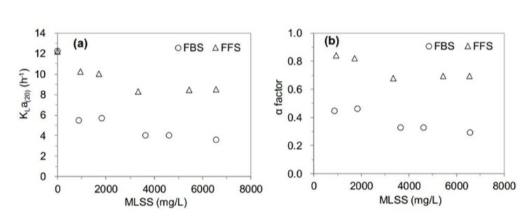 圖3. FBS和FFS的MLSS與(a)KLa(20)和(b)α-因子的相關(guān)性