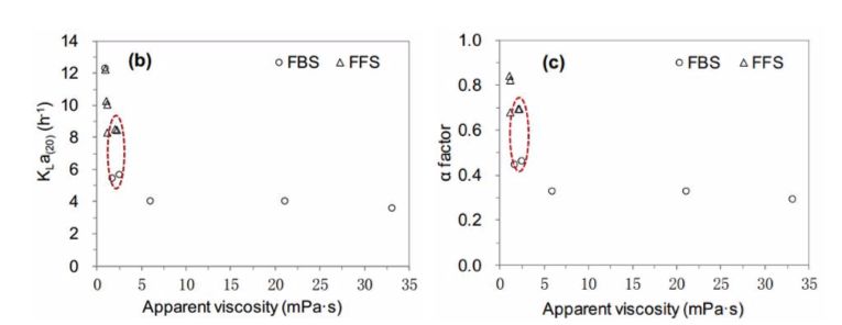 圖4. FBS和FFS的表觀粘度與(a)MLSS、(b)KLa(20)和(c)α-因子的相關(guān)性。