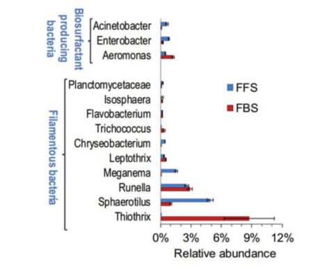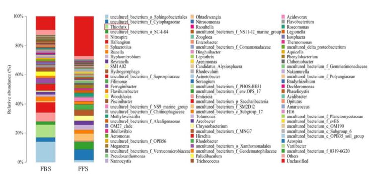 FBS和FFS的菌群結(jié)構(gòu)如圖7所示。FBS和FFS含有大量的共有菌,其中絲硫菌屬(thiothrix)、球衣菌屬(Sphaerotilus)、古字狀菌屬(Runella)、meganema(甲基桿菌科分類下的屬)、纖毛菌屬(Leptothrix)、金黃桿菌屬(chryseobacterium)、毛球菌屬(Trichococcus)、黃桿菌屬(Trichococcus)、isosphaera(浮霉菌科分類下的屬)和浮霉菌科(planctomycetaceae)是FBS和FFS豐度排名前十的菌;?FBS和FFS的優(yōu)勢菌存在差異,未分離培養(yǎng)(uncultured)的噬纖維菌(cytophagaceae)和鞘脂桿菌(sphingobacteriales)分別在FBS和FFS中豐度最高;FFS和FBS的所有菌在各自反應(yīng)器的排出水中均被檢測到。從圖8來看,絲硫菌屬(thiothrix)在FFB中的相對豐度超過8.5%,而在FFS中數(shù)量極少,絲硫菌屬(thiothrix)的長菌絲(0.5-1.5 μm)會連接污泥絮狀物,導(dǎo)致污泥降解能力降低,污水的表面粘度增加;盡管球衣菌屬(Sphaerotilus)和古字狀菌屬(Runella)在FFS和FBS中的豐度均較高,但它們的菌絲較短,對污泥沉降、表觀粘度和氧轉(zhuǎn)運(yùn)的負(fù)面影響較??;其他絲狀細(xì)菌的豐度較低,影響程度較小。因此推測,絲硫菌屬(thiothrix)就是影響FBS氧轉(zhuǎn)運(yùn)的最大“元兇”。從種水平來看,絲硫菌屬(thiothrix)分類下的eikelboomii是FBS的優(yōu)勢菌,至此,“真兇”也基本確定。