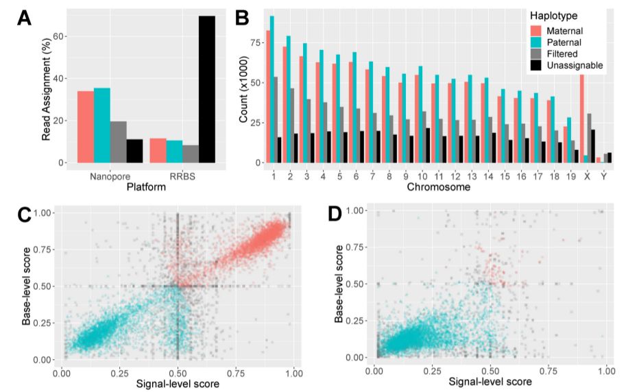 作者定義了兩種分配單倍型的方法(Basecall method基于Fastq數(shù)據(jù),Signal method基于原始電信號)。作者將測序數(shù)據(jù)與SNP標記的基因組進行比對,如果read上有至少5個高置信的SNP則將單倍型分配給Nanopore read,對于RRBS數(shù)據(jù),只要有一個SNP即分配單倍型。結(jié)果發(fā)現(xiàn)只有24%的RRBS測序read被分配了單倍型,而74%的Nanopore測序的read可以被分配單倍型,且父母本等位各一半。同時對于雄性樣品,比對到X染色體上絕大多數(shù)91%的read都被分配為母本單倍型。