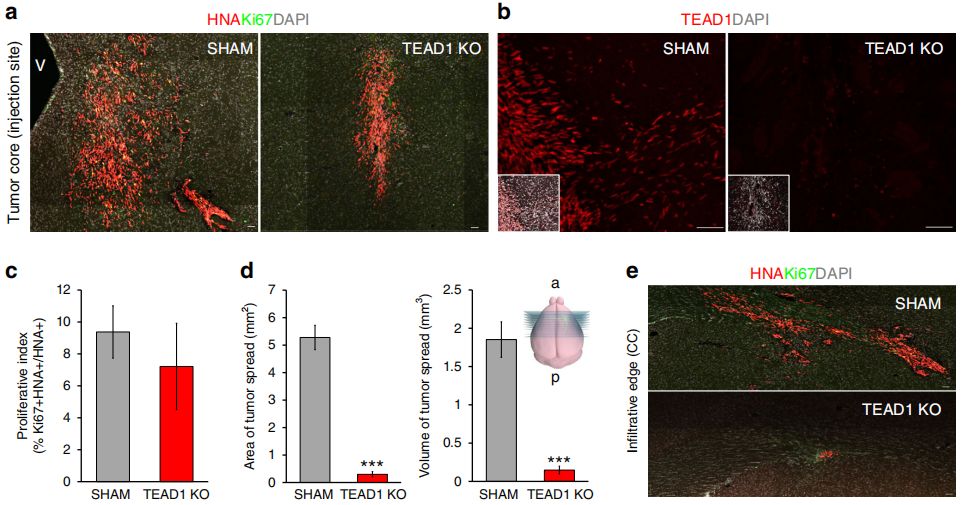 在體外實(shí)驗(yàn)中,利用CRISPR-Cas9基因編輯技術(shù)敲除TEAD1/4,發(fā)現(xiàn)KO腫瘤細(xì)胞系的增殖與遷移受到抑制,而過(guò)表達(dá)TEAD1/4后則可增強(qiáng)其調(diào)控作用,促進(jìn)腫瘤細(xì)胞系的增殖與遷移。在體內(nèi)實(shí)驗(yàn)中,選擇體外抗遷移效果最強(qiáng)的TEAD1KO細(xì)胞系進(jìn)行異種移植,發(fā)現(xiàn)腫瘤浸潤(rùn)的面積和體積均顯著降低??傊?,TEAD1是在GBM遷移中發(fā)揮重要作用的轉(zhuǎn)錄因子。