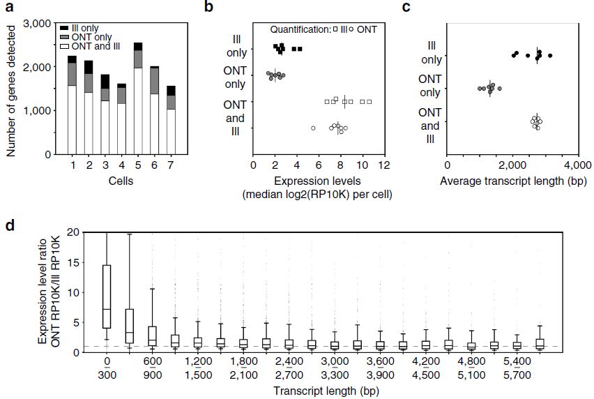 即使產(chǎn)生相對(duì)較少的reads數(shù),ONT RNAseq基因表達(dá)定量也檢測(cè)到了絕大多數(shù)Illumina RNAseq檢測(cè)到的基因(下圖a)。此外,7個(gè)細(xì)胞中的5個(gè),基因表達(dá)檢測(cè)已達(dá)到飽和(下圖S2)。ONT或Illumina RNAseq單獨(dú)檢測(cè)到的基因表達(dá)水平較低,表明這些基因的表達(dá)水平接近兩種技術(shù)的檢測(cè)下限(下圖b)。還觀察到ONT RNAseq單獨(dú)檢測(cè)的基因由較短的轉(zhuǎn)錄本組成(下圖c)。此外,長(zhǎng)度<600bp并且通過ONT和Illumina RNAseq檢測(cè)的基因在Illumina RNAseq數(shù)據(jù)中具有相對(duì)較低的表達(dá)水平(下圖d)。雖然這與在基于Tn5的Illumina文庫(kù)制備中強(qiáng)烈選擇的較短轉(zhuǎn)錄本一致,但不能排除ONT RNAseq可能偏向于較短的轉(zhuǎn)錄本。為排除這種可能性,作者進(jìn)一步選擇合成轉(zhuǎn)錄本混合物SIRVs,分析轉(zhuǎn)錄本長(zhǎng)度是否對(duì)ONT RNAseq表達(dá)定量有影響。