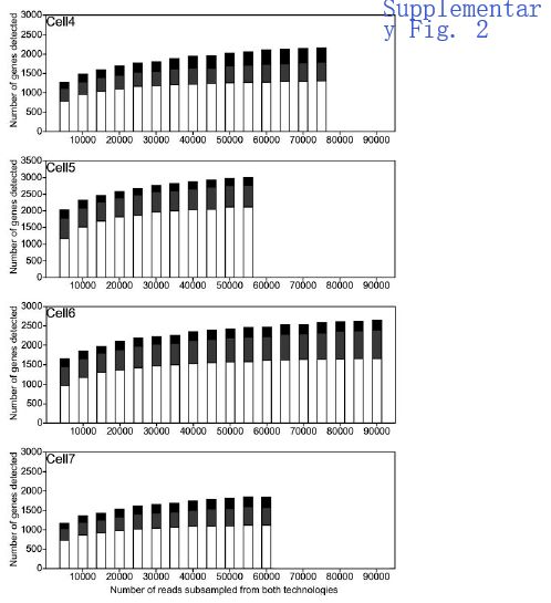 3. 7個(gè)B1a細(xì)胞全長(zhǎng)cDNA分別進(jìn)行二代Illumina轉(zhuǎn)錄組測(cè)序(73,086-351,876 150?bp reads/細(xì)胞)和三代ONT全長(zhǎng)轉(zhuǎn)錄組測(cè)序(R 7.3 17,749-52,696/R9.4 57,874-128,726 ONT reads/細(xì)胞),二者間進(jìn)行比較。