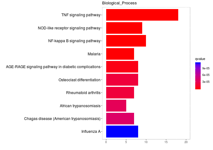 這個(gè)圖與一般的函數(shù)barplot畫出來的不一樣的地方在于它的顏色,這張圖里面的顏色反應(yīng)的是fdr的大小,是一個(gè)連續(xù)值,ggplot2可以將連續(xù)值映射到到顏色上,橫坐標(biāo)是通路中感興趣基因的個(gè)數(shù)。