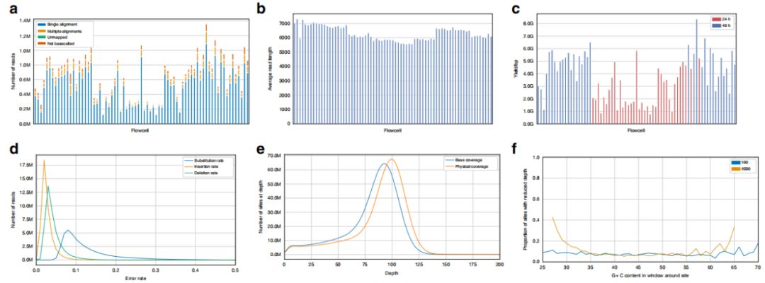 GM12878人B淋巴細(xì)胞采用PCR擴(kuò)增和6kb片段篩選的文庫制備方案,共計(jì)獲得45,740,123條reads(圖1a),平均讀取長度為6373bp(圖1b)在流動(dòng)細(xì)胞中是一致的,并且基于測序文庫的物理大小選擇非常接近預(yù)期??倲?shù)據(jù)量為273.4Gb,每個(gè)flow cell的平均產(chǎn)量為3.7Gb(圖1c)??傆?jì)42,924,782個(gè)高質(zhì)量clean reads的比對率為99.3%,唯一比對率為88.8%。
