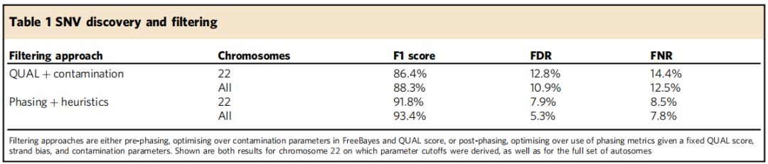 使用過濾器改進(jìn)變異檢測,通過phasing和注釋過濾器(Post?phasing classification)顯著改善變異檢測,*佳結(jié)果F1評分為92.2%,F(xiàn)DR為7.1%,F(xiàn)NR為8.5%(表1,圖2中)。進(jìn)一步考慮覆蓋深度>=60X的假定變異位點(diǎn)(基因組的85%)時(shí),觀察到F1得分改善至93.6%,F(xiàn)DR為6.1%,F(xiàn)NR為6.6%(圖2右),這意味著減少或消除覆蓋深度偏差源(如PCR)的操作改進(jìn)在提高z確性方面可以發(fā)揮一定作用。(百邁客目前ONT全基因組重測序和ONT全基因組甲基化測序建庫過程正是PCR-free建庫–direct-DNA建庫,一是可減少覆蓋深度偏好,有利于提高變異檢測z確度;二是可以保留堿基修飾信息,同時(shí)檢測甲基化修飾等信息)
