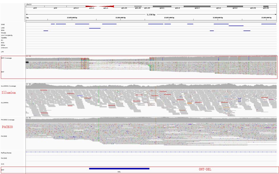 大的結(jié)構(gòu)變異相對于snp和indel少見,但其對罕見疾病的影響可能甚至比目前估計(jì)的更大,因?yàn)楝F(xiàn)有分析檢測這些突變存在技術(shù)困難。采用Sniffles檢測22號染色體SV變異,共計(jì)檢測到82個(gè),其中22個(gè)是在GIAB真實(shí)數(shù)據(jù)集中存在的,之后通過ONT、Illumina和PacBio reads覆蓋數(shù)據(jù)來判斷剩余的60個(gè)SV:其中21個(gè)SV被Pacbio檢測到或reads強(qiáng)烈支持,31個(gè)SV僅ONT reads明顯證實(shí),但PacBio reads很少或不支持。ONT特異性檢測SV可能代表其他技術(shù)遺漏的真實(shí)缺失、由PCR擴(kuò)增產(chǎn)生的假象或在NA12878細(xì)胞系的細(xì)胞培養(yǎng)期間發(fā)生的亞克隆缺失。作者發(fā)現(xiàn)目前ONT平臺(tái)允許檢測大的缺失,靈敏度在60%-91%(21/35和32/35)。