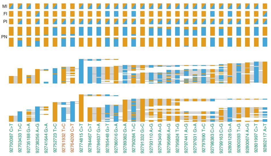 注:前3行為未定相母親(MI),父親(FI),先證者(PI)基因型,第4行為先證者單倍型Phased proband genotypes (PN)。藍(lán)色=alt ,橙色=ref。PN下面2行為單倍型1(母系遺傳)或單倍型2(父系遺傳)對應(yīng)的reads,其中對于每條read,堿基是矩形,reads跨度以水平線顯示。間隙代表gap(缺失)。底部顯示物理位置,感興趣的位點(diǎn)為紅色?;贕RCh37 NM_152703.3, 92761932 T>C對應(yīng)于c.3353 A>G,92764209 C>T對應(yīng)于c.1076 G>A。