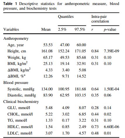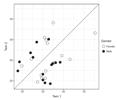 表1展示了樣本相關(guān)人體測量和生化變量的結(jié)果。最后一列是每個(gè)變量的對內(nèi)相關(guān)性。大多數(shù)變量具有相當(dāng)高的和/或顯著相關(guān)性,一些顯示低或不顯著的對內(nèi)相關(guān)性(例如GLU,TG)。下圖顯示了每對雙胞胎的BMI測量值。所有雙胞胎都與對角線保持距離,表明BMI測量中的對內(nèi)不一致。同時(shí),圖中的總體模式還表明如表1中報(bào)告的BMI的弱配對內(nèi)相關(guān)性(r = 0.307,p = 0.099)。在男性(實(shí)點(diǎn))和女性(空點(diǎn))雙胞胎中沒有觀察到BMI不一致的性別特異性模式。
