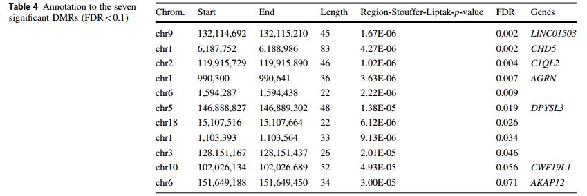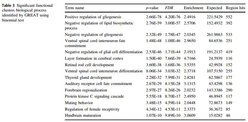 采用biomaRt,38487個(gè)CpG中(P<0.05),23,863個(gè)CpG注釋到2542個(gè)功能基因,基于GSEA在BioCarta 基因集, KEGG 基因集和Reactome基因集富集分析。富集通路相關(guān)基因包括參與編碼細(xì)胞外基質(zhì)(ECM)相關(guān)蛋白,包括ECM糖蛋白、膠原蛋白和蛋白多糖;以及參與神經(jīng)元系統(tǒng)和發(fā)育生物學(xué)的基因。富集結(jié)果也涉及神經(jīng)元功能通路,涉及參與化學(xué)突觸傳遞,軸突導(dǎo)向和NGF信號傳導(dǎo)(神經(jīng)生長因子)的基因。38,487(p < 0.05)個(gè)CpGs采用GREAT分析其富集的調(diào)控區(qū)域。結(jié)果表明15個(gè)具有統(tǒng)計(jì)學(xué)意義(p < 1.072e-10)的生物學(xué)功能聚類,涉及膠質(zhì)細(xì)胞再生正負(fù)調(diào)節(jié)(FE:2.49, FE:2.03)、脂質(zhì)合成負(fù)調(diào)節(jié)( FE:2.61)、甲狀腺發(fā)育 (FE:2.83)、視網(wǎng)膜桿細(xì)胞發(fā)育(FE: 3.54)等。
