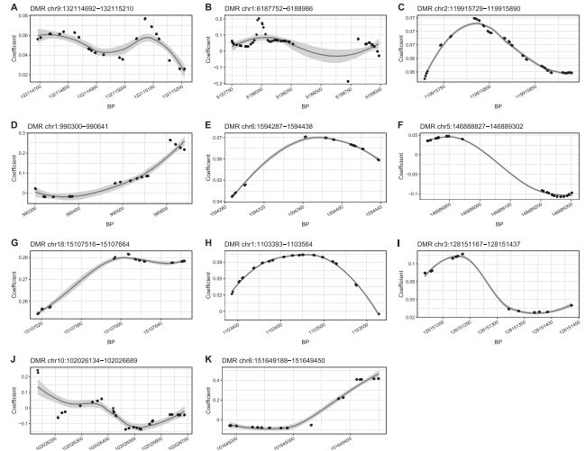采用comb-p矯正p,鑒定出11個(gè)FDR<0.1的DMR,其中9個(gè)FDR<0.05,位于染色體1、2、3、5、6、9、10和18 。4個(gè)有意義的 DMRs (從chr 1:1103393-1103564,chr 1:990300-990641;chr 6:1594287-1594438;?chr 10:102026134-102026689 )包含了有顯著意義的CpGs 。4個(gè)DMR位于基因間區(qū),其余7個(gè)注釋在9號染色體LINC01503(RNA基因)、5號染色體DPYSL3(與非酒精性脂肪肝相關(guān)), 1號染色體CHD5和AGRN(有研究孕婦體重指數(shù)對新生兒血液DNA甲基化的影響), 2號染色體C1QL2, 10號染色體CWF19L1, 及6號染色體 AKAP12。圖中展示了11個(gè)DMR的甲基化模式,除了圖f和j的DMR與BMI呈負(fù)相關(guān)外,其余9個(gè)DMR與BMI呈正相關(guān)。采用Danish雙胞胎的基因表達(dá)數(shù)據(jù),檢驗(yàn)了與11個(gè)DMR相關(guān)的7個(gè)基因表達(dá)水平與BMI的相關(guān)性。LINC01503和AKAP12有顯著意義。