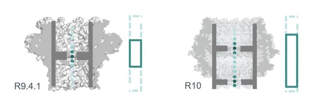 新升級(jí)R10芯片大的更新是納米孔采用了雙讀取器(Reader)的設(shè)計(jì),能夠?qū)ν粔A基進(jìn)行兩次信號(hào)識(shí)別。理論上,同一堿基的識(shí)別次數(shù)為R9.4.1版本芯片2倍,由此來增加堿基的判斷率,減小隨機(jī)錯(cuò)誤,并提高一致準(zhǔn)確性。R10與R9.4.1測序方式比較如圖1
