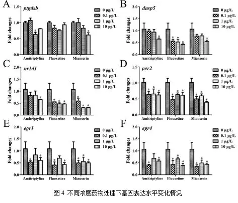 作者用三種不同濃度的抗抑郁藥(0.1、1和10 μg /L)處理斑馬魚(yú)胚胎,應(yīng)用qPCR試驗(yàn)確定6個(gè)選定的基因的濃度—應(yīng)答關(guān)系。結(jié)果表明,ptgdsb的mRNA水平只在1 μg /L阿米替林和10 μg /L米安色林處理組顯著降低;而dusp5表達(dá)水平在10 μg /L阿米替林和米安色林處理組以及所有氟西汀處理組中均顯著降低;除了在1和10 μg /L阿米替林處理組中的nr1d1表達(dá)水平未受抑制之外,nr1d1和per2在幾乎所有抗抑郁藥物處理組均受到顯著抑制。此外,兩個(gè)與早期生長(zhǎng)應(yīng)答相關(guān)的基因egr1和egr4在0.1和10 μg /L阿米替林處理組和所有米安色林處理組中表達(dá)下調(diào),egr4在所有氟西汀處理組降低,而egr1只在0.1和10 μg /L氟西汀處理組中表達(dá)降低(圖4)。