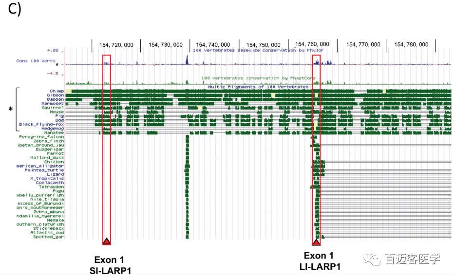 接下來(lái),作者對(duì)SI-LARP1是否可以發(fā)揮獨(dú)特的功能作用感興趣。為此分析了2種LARP1亞型的TSS區(qū)保守水平(圖5C)。作者假設(shè),進(jìn)化保守將暗示選擇性壓力,因此每種亞型的作用不同。為了解釋LARP1亞型的進(jìn)化保守性,使用UCSC基因組瀏覽器在脊椎動(dòng)物(鳥(niǎo)類、魚(yú)類、兩棲動(dòng)物、爬行動(dòng)物、哺乳動(dòng)物)亞門上生成了100個(gè)可用LARP1序列的多序列比對(duì)。出乎意料的是,LI-LARP1外顯子1在整個(gè)亞科中都具有很強(qiáng)的保守性,但SI-LARP1外顯子1的保守性僅存在于胎盤動(dòng)物分支中,其中包括人類和其他靈長(zhǎng)類動(dòng)物。這表明它可能在胎盤哺乳動(dòng)物的進(jìn)化晚期獲得了功能性作用。相比之下,LI-LARP1的保守性跨多個(gè)進(jìn)化分支表明作用更為古老。