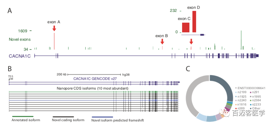 在CACNA1C基因座內(nèi)總共注釋了39個(gè)潛在的新外顯子,其中38個(gè)在至少2個(gè)人或組織中被識(shí)別,并在每個(gè)文庫中得到至少5條nanopore reads的支持(圖2A)。通過PCR和Sanger測序確認(rèn)了新的外顯子與其周圍的注釋外顯子之間的剪接連接,從而驗(yàn)證了四個(gè)新的外顯子。這種新的外顯子的成功驗(yàn)證提供了很高的可信度,即通過納米孔測序鑒定的新的外顯子是真實(shí)的,并且被整合到CACNA1C轉(zhuǎn)錄本中。表達(dá)量最高的10條轉(zhuǎn)錄本中,有9條是新的且其中有8條被預(yù)測保持CACNA1C閱讀框架,這表明這些最豐富的新轉(zhuǎn)錄本中有一些編碼功能不同的蛋白質(zhì)異構(gòu)體(圖2B,C)。這些結(jié)果表明,新的CACNA1C轉(zhuǎn)錄本表達(dá)豐富,數(shù)量也很多,目前的注釋缺少許多最豐富的CACNA1C轉(zhuǎn)錄本。
